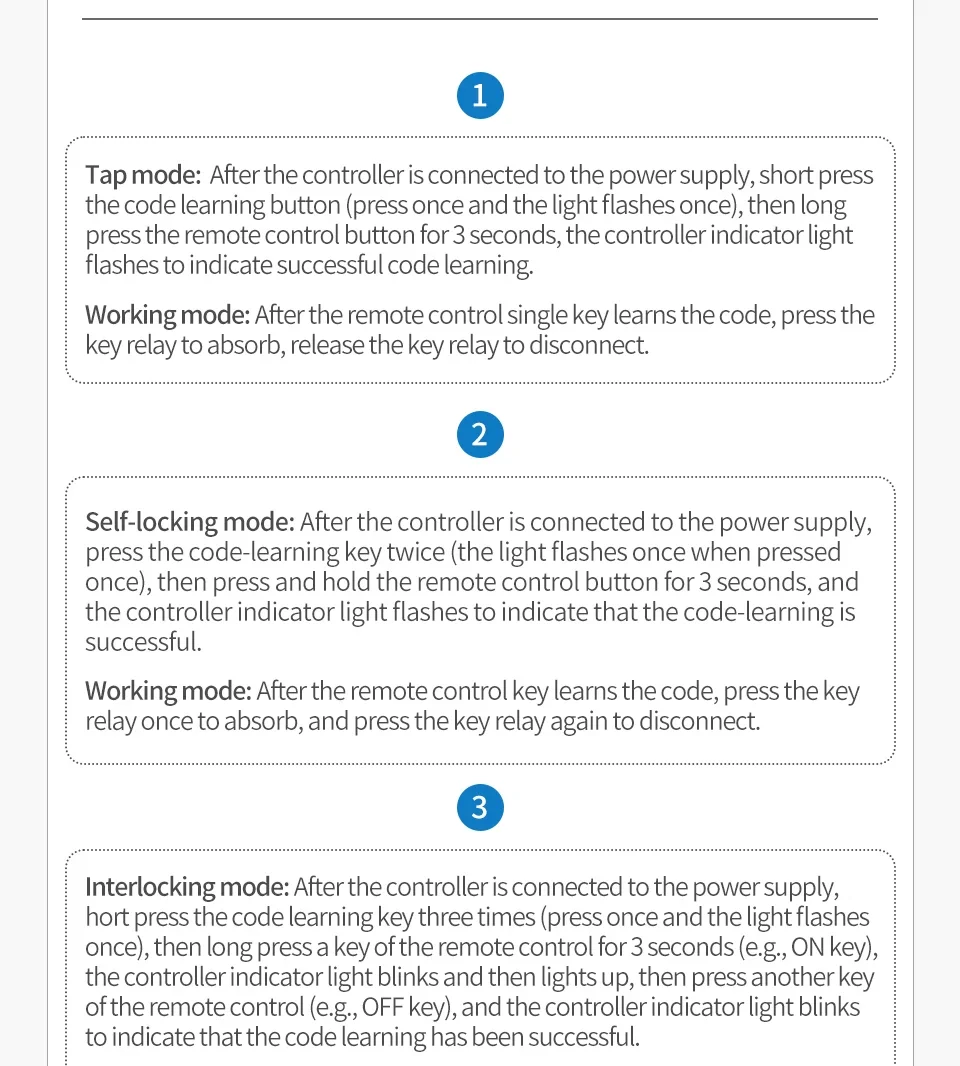 Working mode: Momentary, Toggle, Latching Time delay (5s ,10s ,15s )