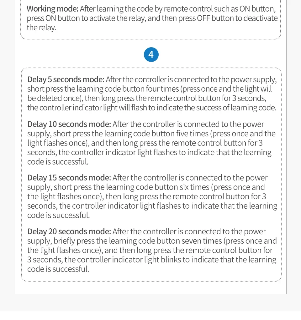 Time Delay Mode: Press the remote control button, the relay connects; Start timing when release the remote button, the relay disconnect automatically after 5s or 10s or 15s